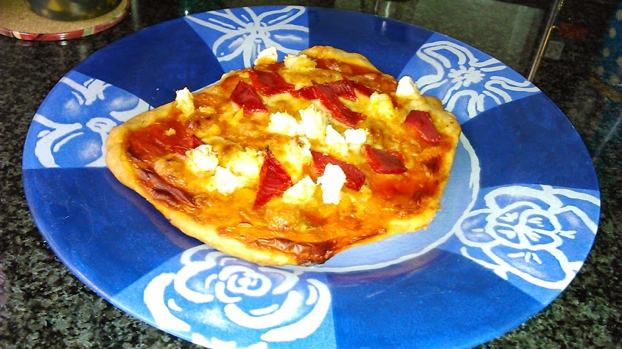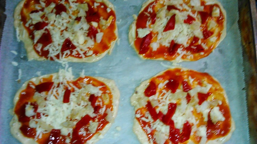 Con la masa, hacemos cuatro bolas del tamaño de una pelota de tenis y aplastamos con las manos o con un rodillo. Disponemos sobre la bandeja del horno forrada con papel vegetal.