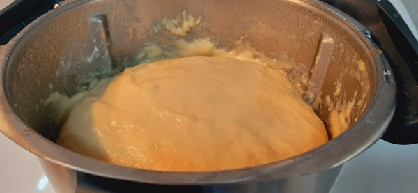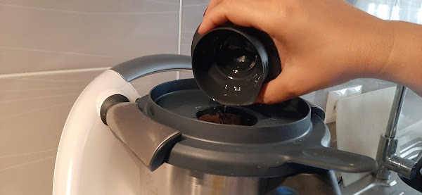 6.- Amasamos un minuto, velocidad espiga y vamos volcando el aceite poco a poco por el bocal.