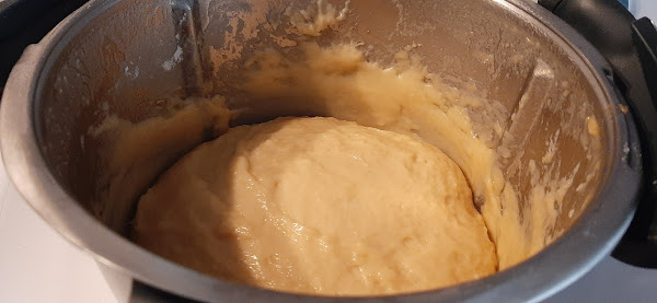 8.- Con la espátula, bajamos la masa de las paredes del vaso hacia el fondo y amasamos 30 segundos, velocidad espiga.