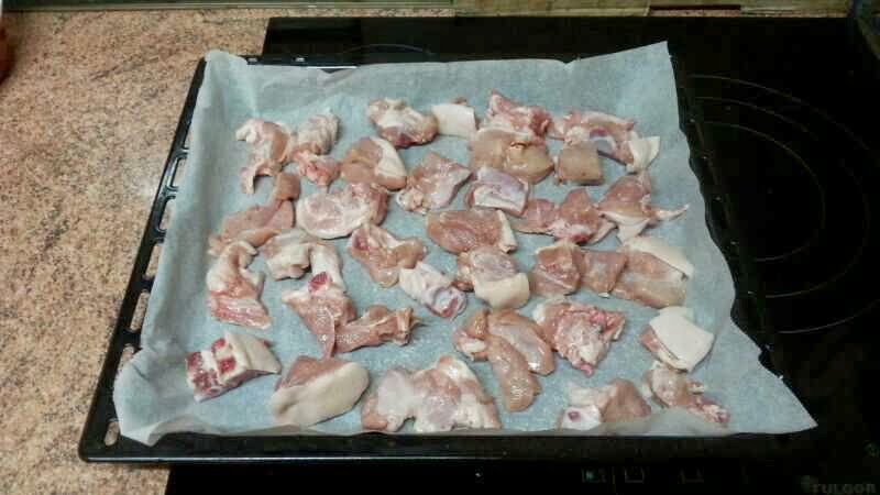 Ponéis en una bandeja de horno papel vegetal, precalentais el horno a 200 grados, ponéis sobre la bandeja el cochinillo en trozos, lo metéis y de vez en cuando le vais dando vueltas a los trozos, cuando ya lo veáis que esta casi hecho subís el horno a tope para que se quede crujiente la piel y listo.