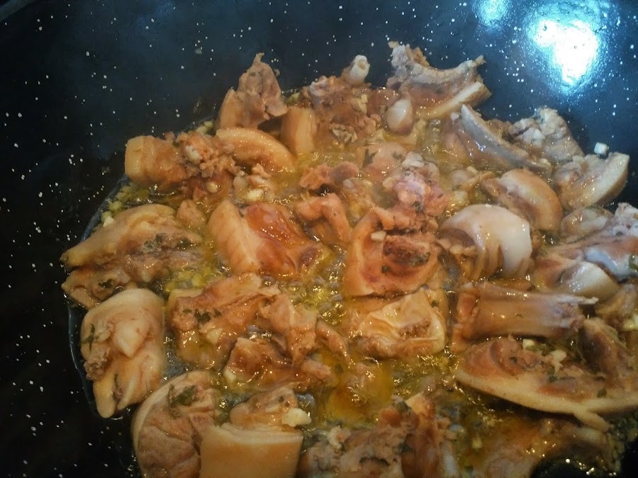En un perol o sartén grande, pon el aceite de oliva y agrega el cochifrito ya escurrido con cuidado. Pon una tapadera por si salpica el aceite.