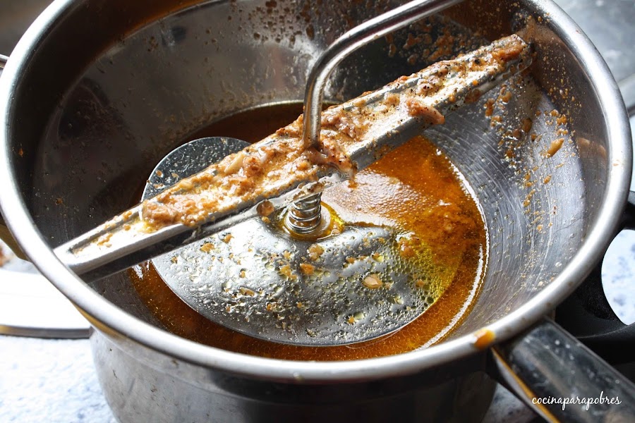 Sacamos la carne, pasamos el jugo que nos queda por un colador y dejamos la salsa al fuego para que reduzca algo mas de la mitad.