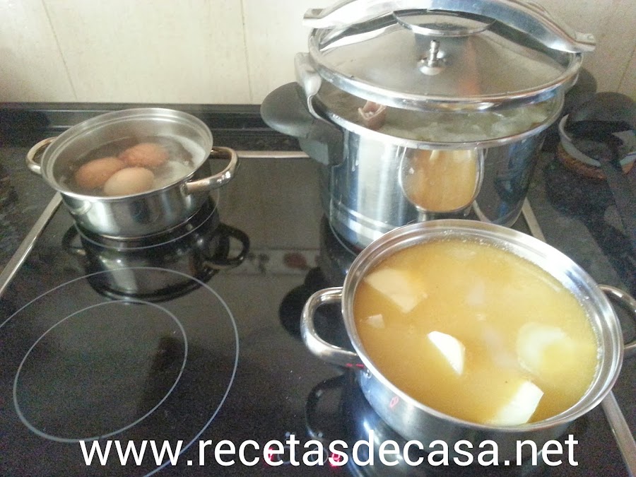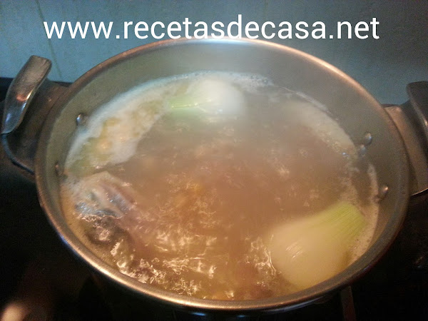 Cocemos partiendo desde abundante agua fría la punta de jamón, el tocino o panceta y la gallina. Durante toda la cocción iremos retirando la espuma que se forme.