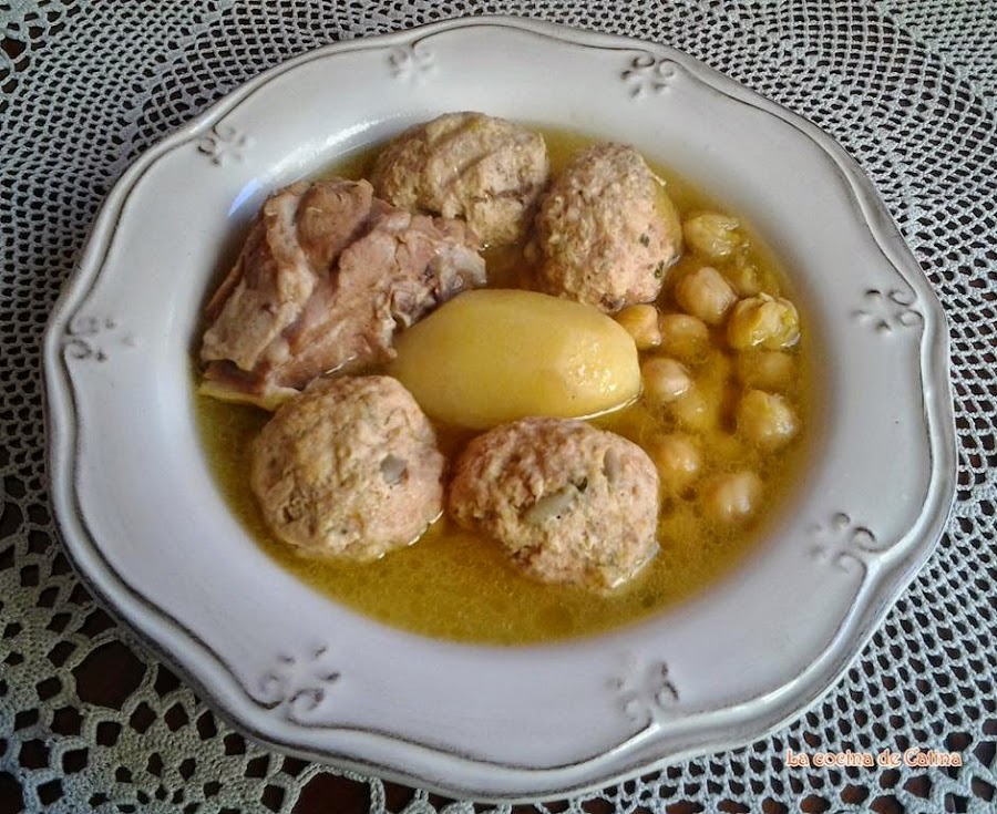Una vez que se pueda abrir la olla se agregan al cocido las patatas, las pelotas y un picadillo de azafrán, ajo y perejil, rectificamos de sal si es necesario.