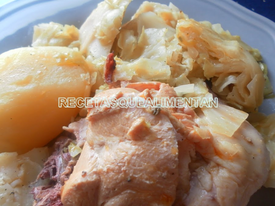 Una col mediana, medio pollo, un chorizo poco curado, 4 patatas medianas, una cebolla, 2 dientes de ajo, una hoja de laurel, romero, pimienta negra molida, un chorro de aceite de oliva, agua y sal.