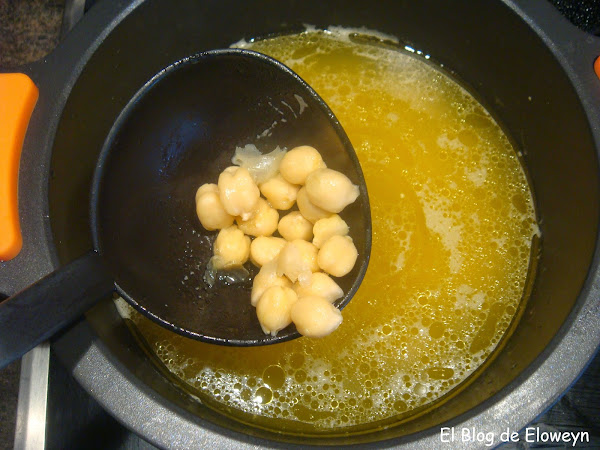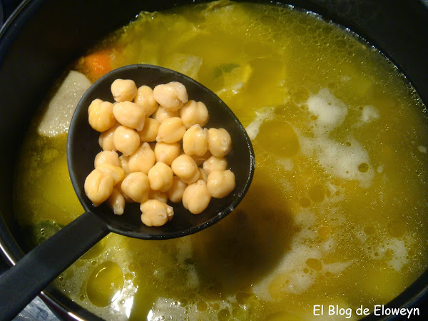Poner a hervir el caldo. Cuando comience a hervir, añadir el resto de los garbanzos.