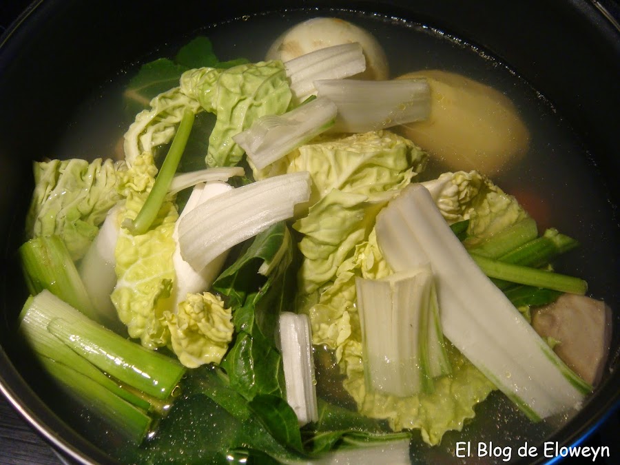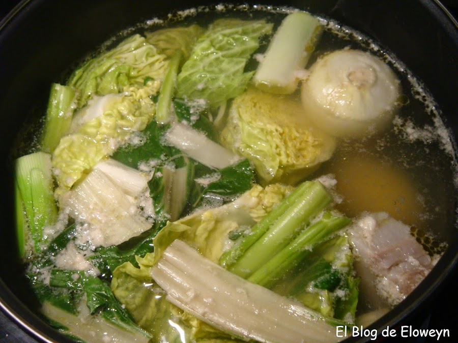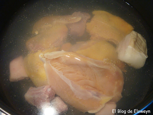 Poner a hervir en una olla bien grande abundante agua y sal. Una vez arranque a hervir, añadir la carne. No hace falta poner aceite porque el tocino ya tiene suficiente grasa.