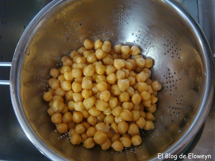 Sacar los garbanzos del bote y ponerlos en un colador. Lavarlos para quitarles el líquido.
