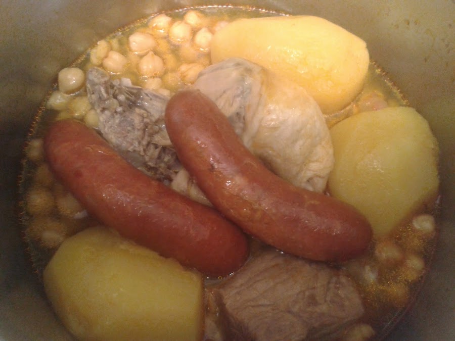 1 chorizo que no esté curado, asturiano sería idealLos garbanzos necesitan un remojo de al menos 8 horas, los cubrimos bien de agua y los dejamos que se hidraten bien. Lavamos bien las carnes, las zanahorias las pelamos y lavamos y el puerro quitamos la primera capa y hacemos cuatro cortes largos en la parte verde y lavamos bien eliminando toda la tierra.. Las patatas las pelamos y las dejamos enteras. Cubrimos de agua hasta el nivel máximo de la olla express. Ponemos un buen puñado de sal y añadimos el azafrán o colorante alimentario..