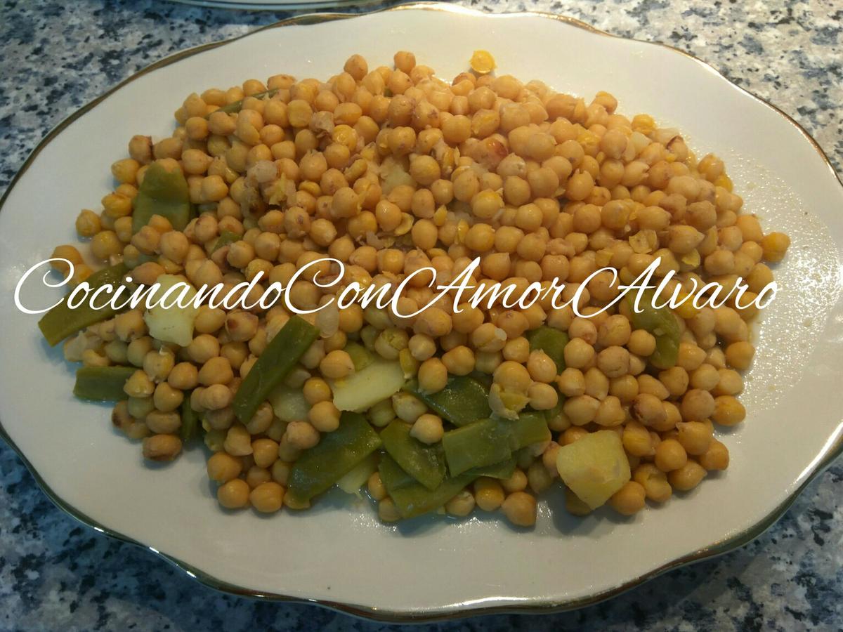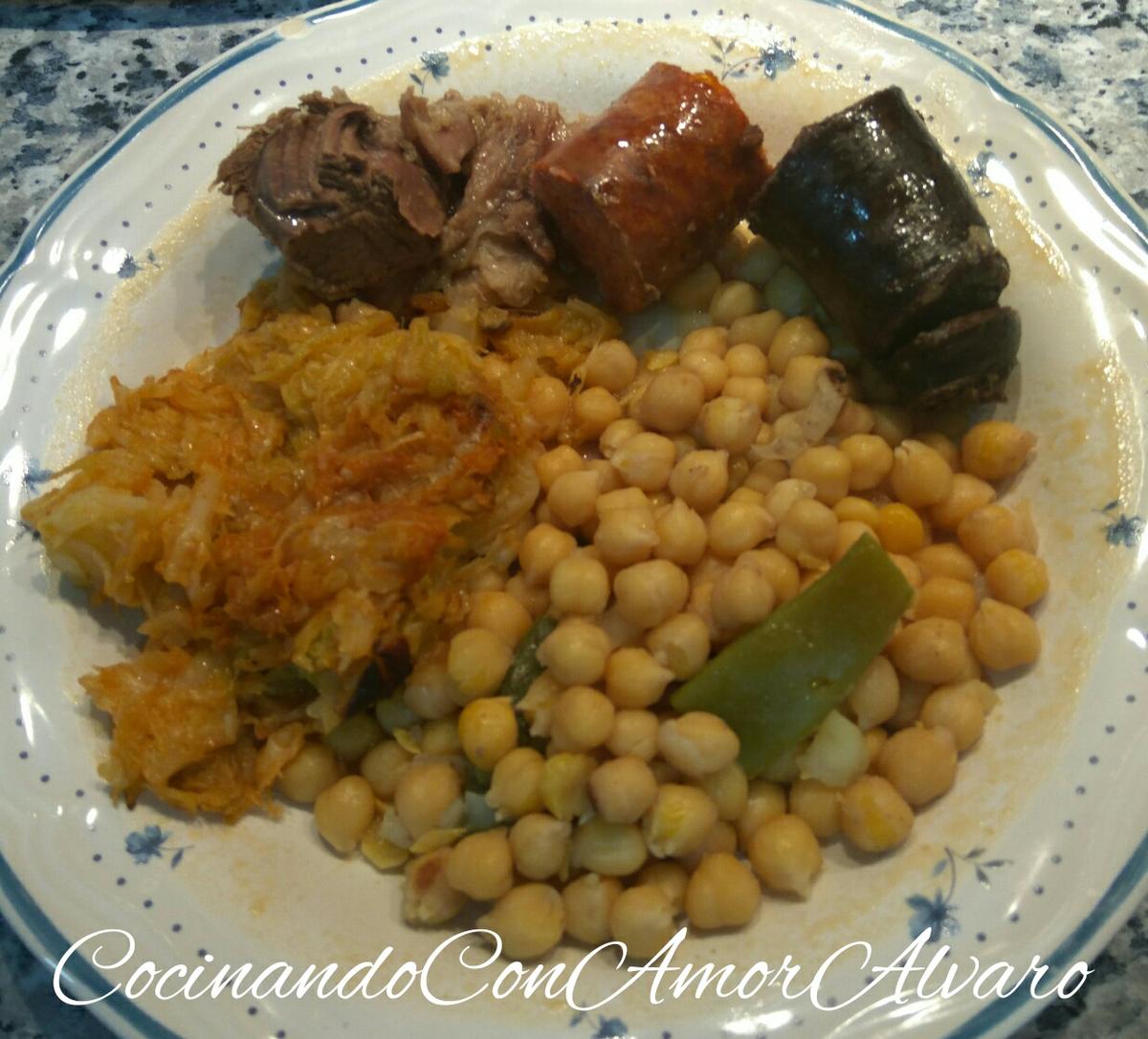 En otra fuente, los garbanzos con la patata, zanahoria y el repollo rehogado.