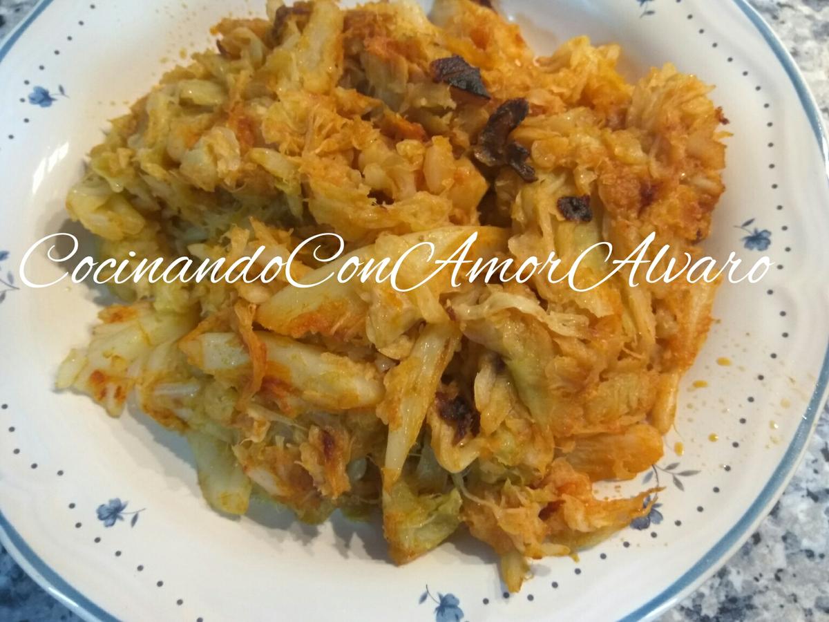 Una vez cocida, escurrimos bien, y pelamos los ajos laminados y los añadimos a una sartén. Vamos a rehogar la col con los ojos, y en el último momento echamos el pimentón dulce. Removemos bien, y apartamos sin que llegue a quemarse, si no después amargara.