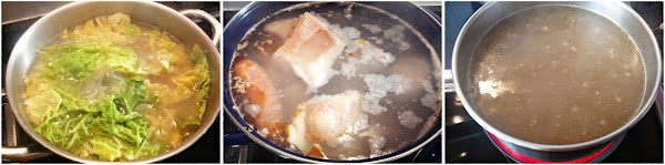 Lava la carne: muslo de gallina, y morcillo, los huesos: de jamón y ternera, y el tocino. Sazona. Cubre con agua y cuece a fuego lento 1 HORA en una olla grande. Retira la espuma cada vez que se forme en la superficie (para quitar las impurezas que sueltan los alimentos).