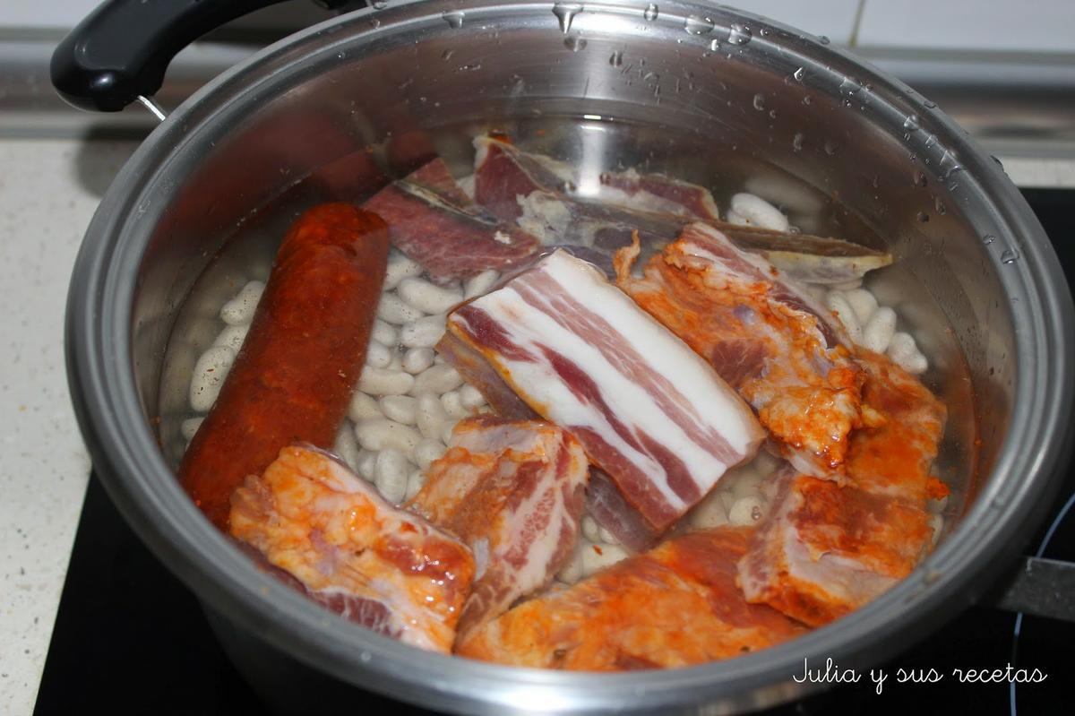 En una olla profunda ponemos las judías escurridas, la panceta, la costilla, el hueso de jamón y el chorizo, y si le ponéis oreja o manitas.