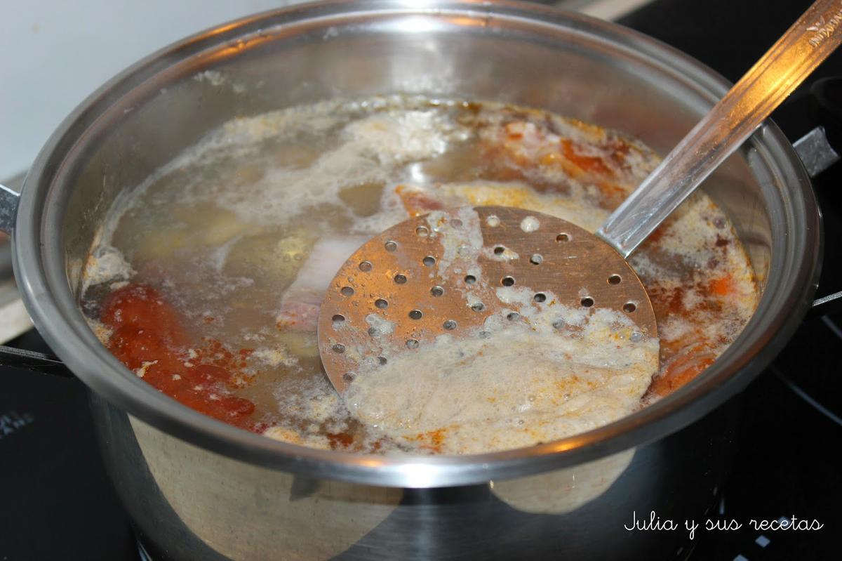 La ponemos al fuego medio-bajo y dejamos se se cuezan lentamente durante 1 hora y media. Al principio saldrá un poco de espuma que retiraremos con una espumadera.