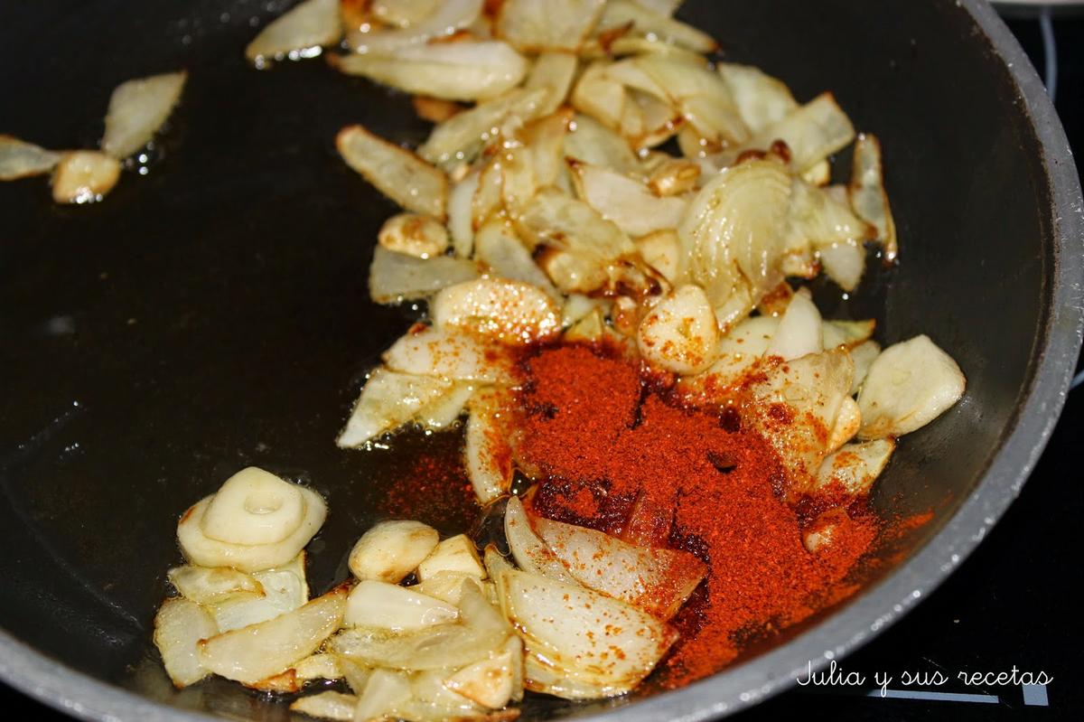 Mientra se cuece en una sarten ponemos un poquito de aceite y sofreímos la cebolla y los ajos. Cuando están dorados añadimos una cucharadita de pimentón fuera del fuego. Lo ponemos en el vaso de la batidora y lo trituramos con una poquita agua. Lo reservamos.