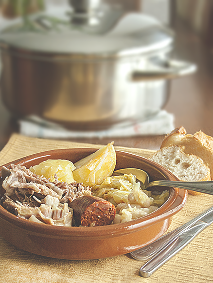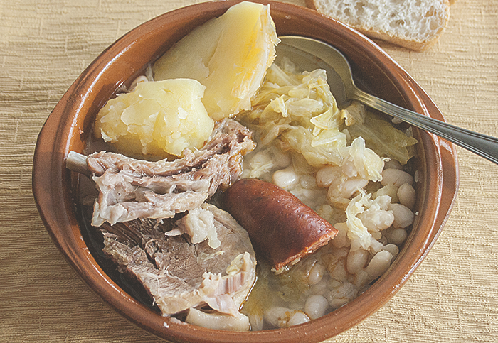 Servimos troceando la costilla y el lacón, y cortando en tres trozos los chorizos.