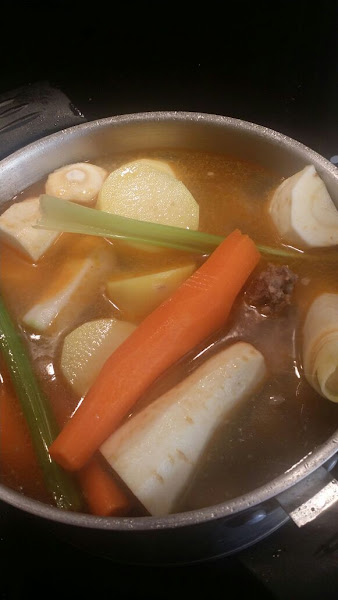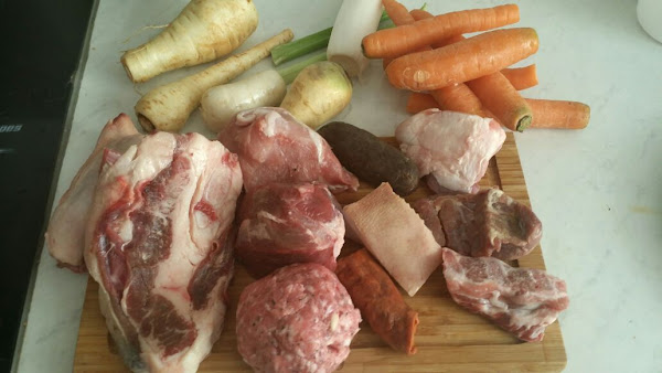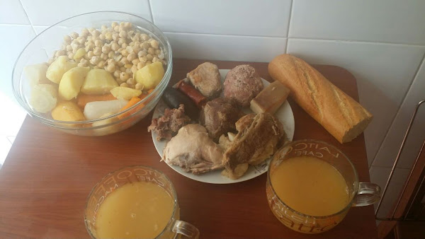 Ponemos un caldero (también conocido como olla) alt@ con un poco de aceite, en este doramos la carne (con esto hacemos que la carne se selle y no pierda su jugosidad). Añadimos los huesos y los embutidos ( morcilla y chorizo); cubrimos todo esto con agua hasta superarlos dos dedos por encima de la carne y demás. Dejamos hervir a fuego bajo durante una hora. Mientras retiramos la espuma que va apareciendo por arriba (hacemos esto para retira las impurezas de la carne, también la grasa).