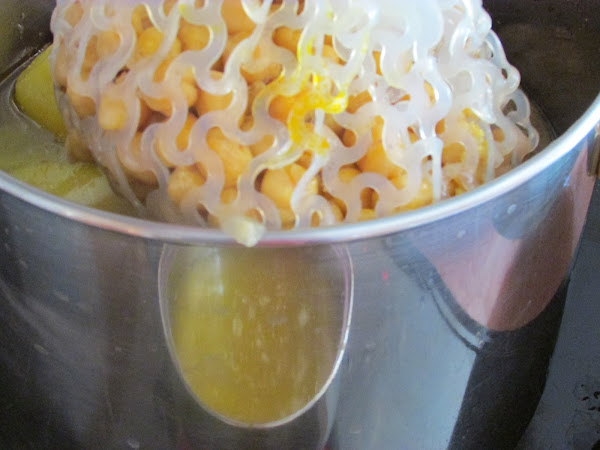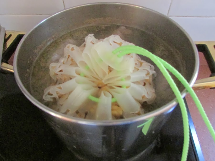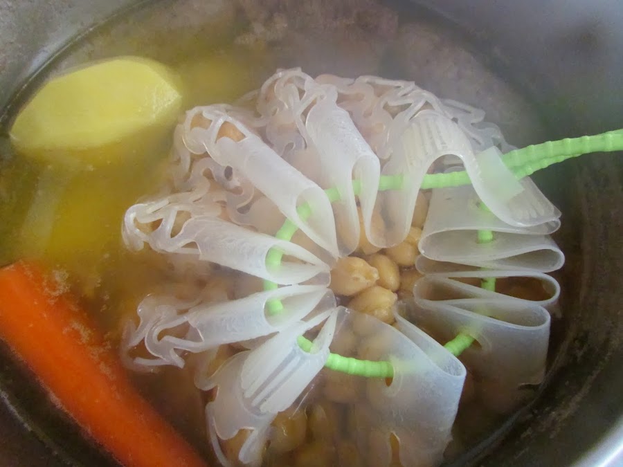 Ponemos los Garbanzos ( yo los pongo dentro de una malla y así no cuestan nada de sacarlos luego), y seguimos cociendo 1 hora más.