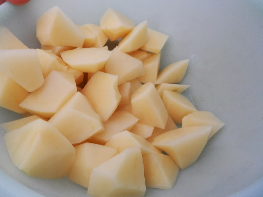 Preparamos las patatas, las cortamos en cachelos y las añadimos.