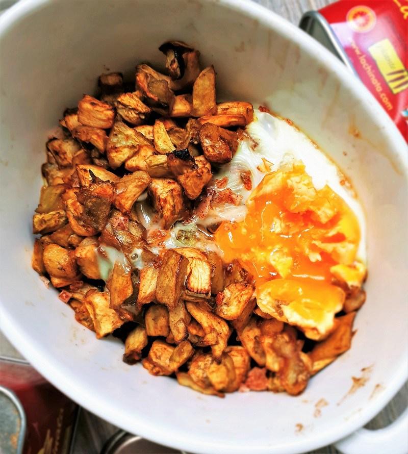 Ahora sólo queda coger el pan, porque esta berenjena es muy sana y rica, pero invita a acompañar con pan, romper la yema del huevo que debe haber quedado en su punto.