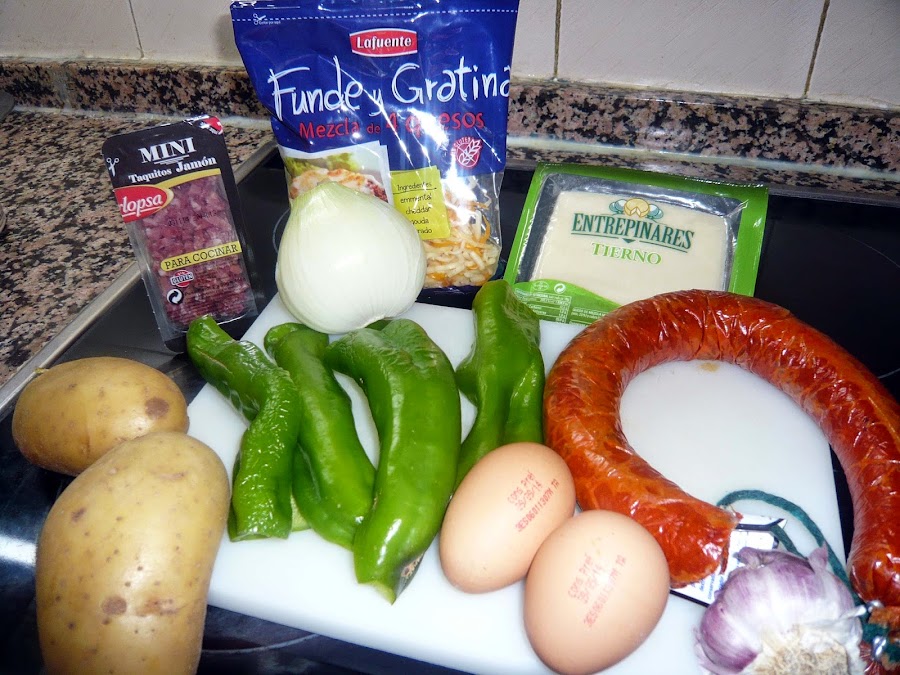 Hacemos un sofrito con los pimientos, los ajos y la cebolla. Cuando esté todo pochado, le añadimos la patata que hemos vaciado, chafada con un tenedor, los taquitos de jamón, los trocitos de chorizo y el queso rallado. Lo mezclamos todo bien.