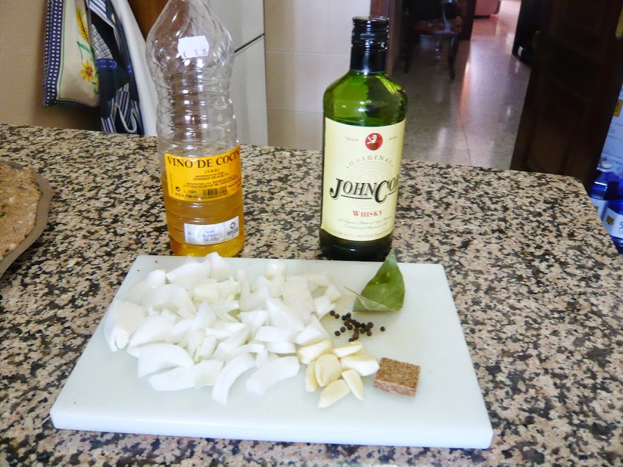 En el aceite donde hemos sellado la carne doramos los ajos, la cebolla cortada a cascos, la hoja de laurel y la pimienta en grano. Una vez pochado, le ponemos el whisky y flambeamos. Siempre con mucha precaución y quitando el extractor y con mucho más cuidado que el que tuve yo (mirad el vídeo :( )