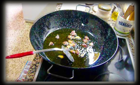 4. En un perol de dimensiones adecuadas a la cantidad de pan (que haya espacio para mover) se echa el aceite y se calienta. Los dientes de ajo, sin pelar y con un corte dado o golpe, se echan en el aceite caliente y se mueven hasta que se doren. Se apartan.