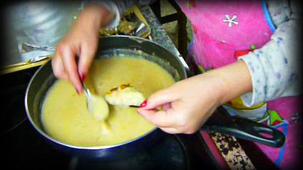 Una vez frías las pintamos con huevo batido, le ponemos pan rallado por encima y las vamos friendo. Se sirven calientes.