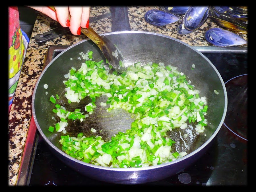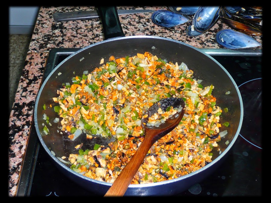En una sartén ponemos aceite y pochamos la cebolla y los pimientos, ambos muy picados. Una vez pochados, añadimos los mejillones muy picados que previamente habremos sacado de sus conchas (estas las reservamos, sólo las que no estén rotas) lo mezclamos todo muy bien. Apartamos y reservamos.