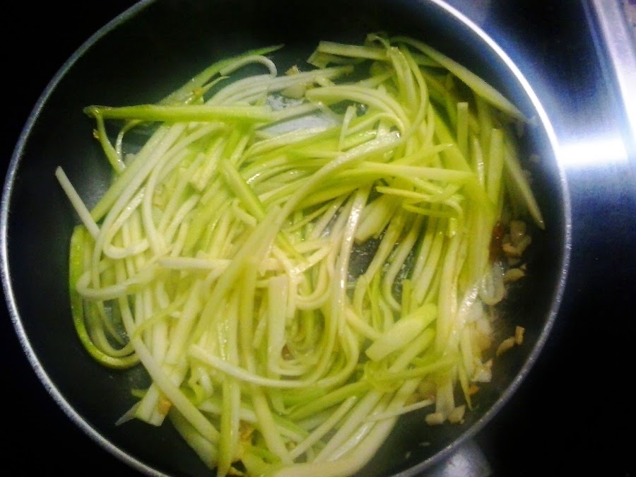 Una vez cortado a nuestro gusto, tan solo hay que ponerlos en una sartén con un poco de aceite y pocharlos un poquito. Recordad que el calabacín pierde mucho volumen