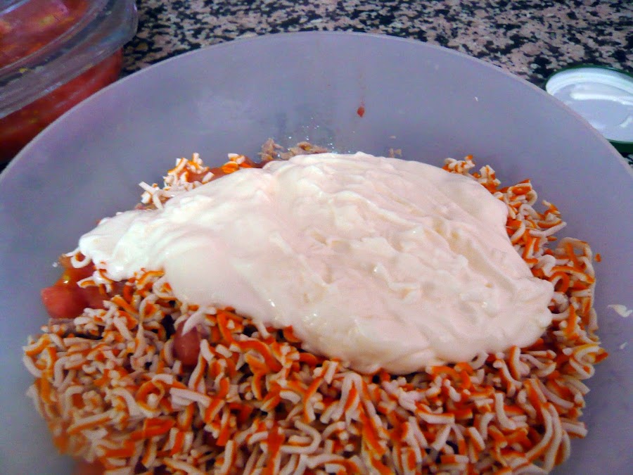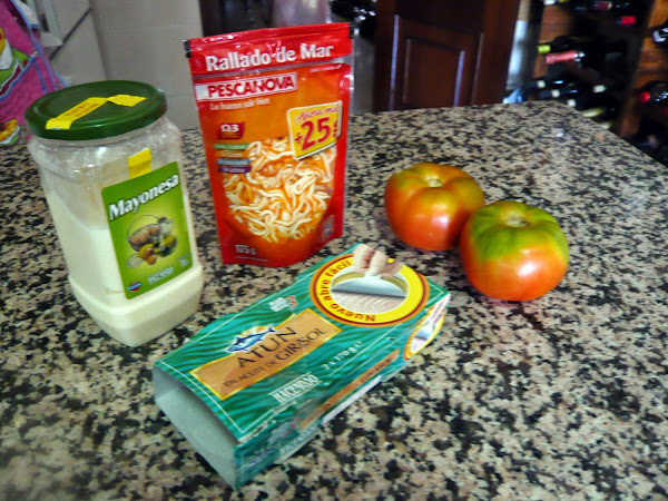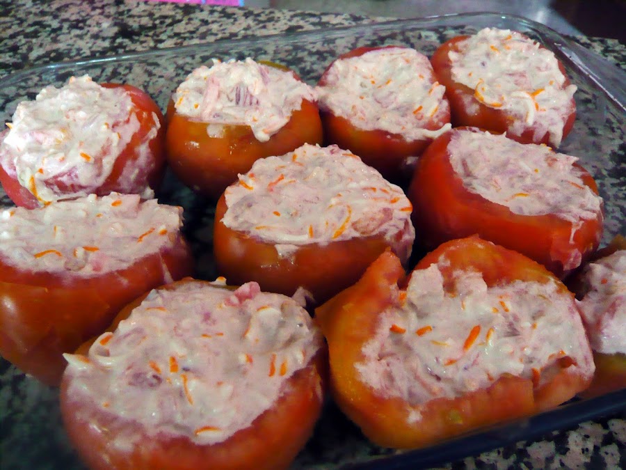 Una vez vaciados y escurridos, los rellenamos con la mezcla de atún, delicias, mahonesa y carne de la que sacamos de los tomates.
