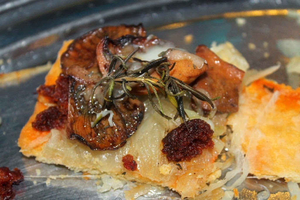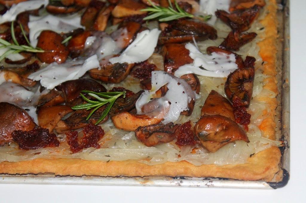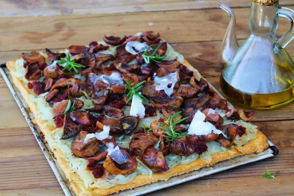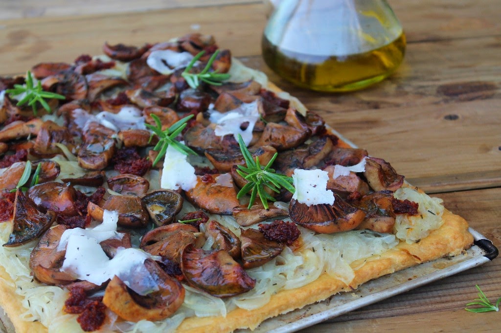 Dicho esto, en esta receta nos proponemos disfrutar el doble y hemos casado las setas con la sobrasada en un conjunto que resulta exquisito y que combina perfectamente, sobre una base de pasta crujiente, una cama de cebolla con aroma a tomillo, porque las setas saben a monte, y lo hemos rematado con unas lonchas casi transparentes de un queso de cabra mallorquín semi y unas ramitas de romero para darle un toque decorativo y con sabor a otoño inconfundible. Bon profit!!!