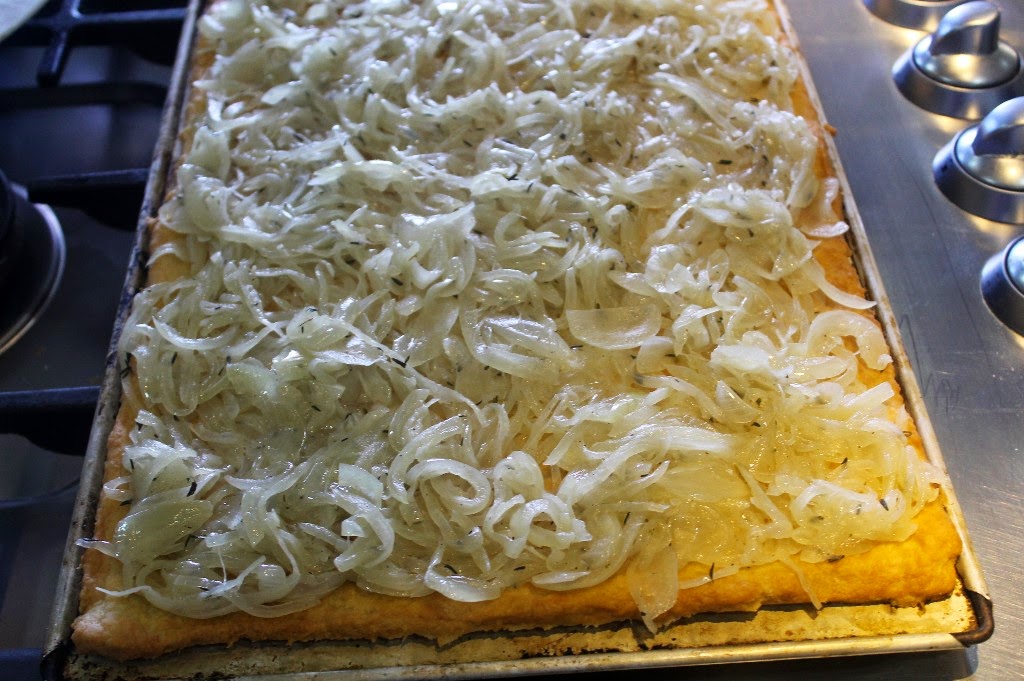 Mientras está fermentando la masa, pelamos y cortamos las cebollas en juliana y ponemos una sartén con un poco de aceite de oliva, añadimos la cebolla y dejamos pochar bien sin que tome color, ponemos sal y pimienta. Cuando esté blanda añadimos tomillo fresco o seco. Colamos en un colador para que suelte toda el agua y quede seca.