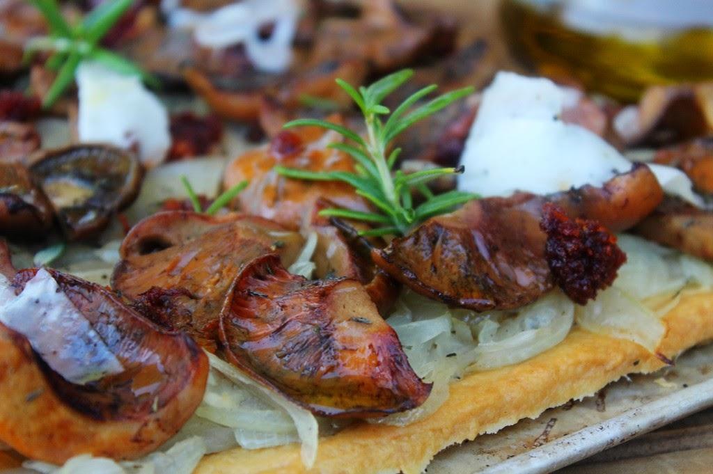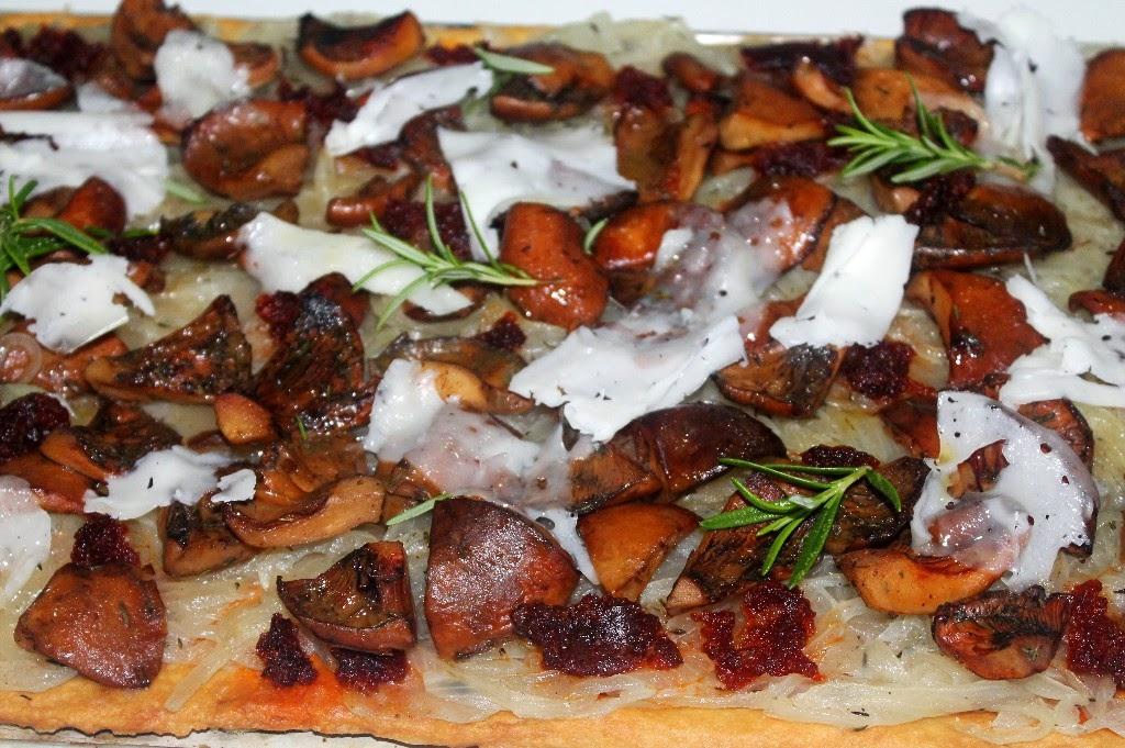 Sacamos la masa, ponemos la cebolla, las setas, entre y entre trocitos de sobrasada y espolvoreamos con tomillo y romero, ponemos al horno unos 5-8 minutos hasta que la sobrasada se derrita no mas tiempo y enseguida que la saquemos cortamos unas láminas muy finas de queso por encima para que se funda un poco, añadimos un poco de aceite de oliva virgen extra y espolvoreamos con pimienta negra recién molida.