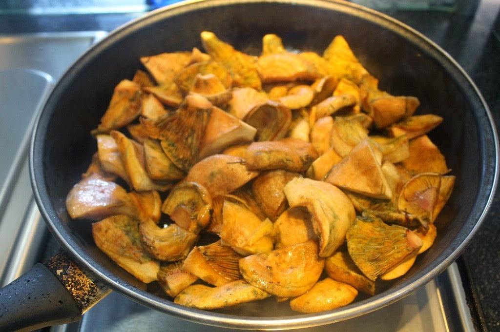 Por otro lado limpiamos las setas y las cortamos en trozos no muy pequeños, las salteamos en una sartén con unas gotas de aceite de oliva, han de estar al dente, no le pongáis sal hasta que estén hechas para que no suelten agua y se cuezan en lugar de saltearse.