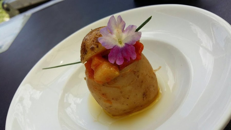 Papita rellena de pisto, gazpacho de patatas rojas y pastelillo de patatas con higos y pasas de Málaga.