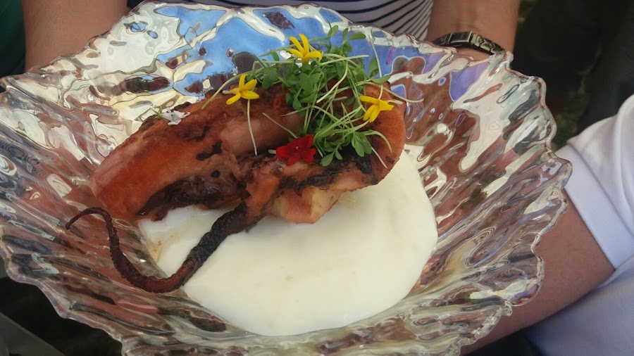 Una espuma de patata asada con pulpo a la parrilla, y patata aliñada con gazpachuelo de almejas.