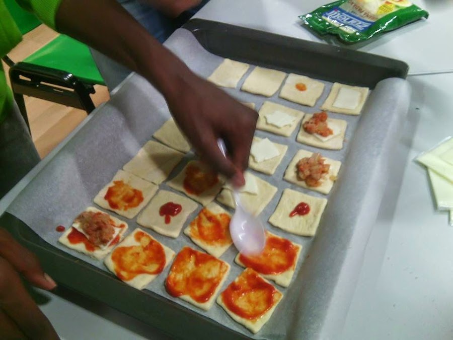 Primero hicieron la masa de la pizza, cogiendo todos los ingredientes ( harina, agua, aceite, sal, azúcar y levadura) y mezclaron bien. Como la masa quedó un poco seca le pusieron un poco más de aceite. Después hicieron una bola y la dejaron reposar durante más o menos 40 minutos.