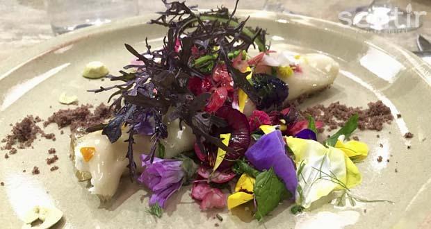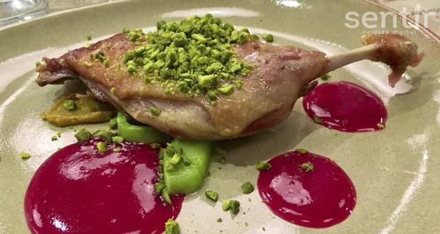 La primavera se abre paso y crece el interés por la experimentación; las flores cubren con desorden pero exquisito concierto un canelón de gelatina que envuelve con esmero una brandada de bacalao como prolegómeno del plato principal: un confit de pato con pistachos, higos chumbos y flor de saúco.