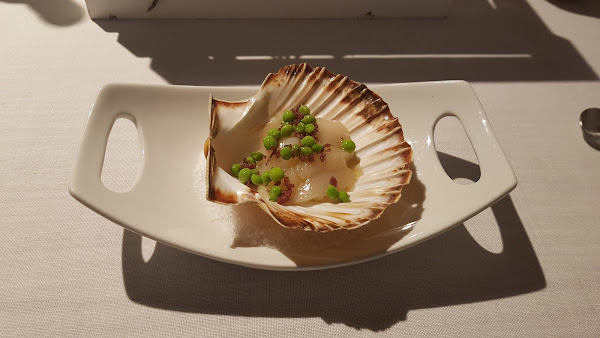 Seguidamente ya comenzamos con una vieira curada con ibéricos y guisantes, tenía mucho sabor y aunque era poquito te dejaba muy buen gusto, el emplatado de los más original que e visto.