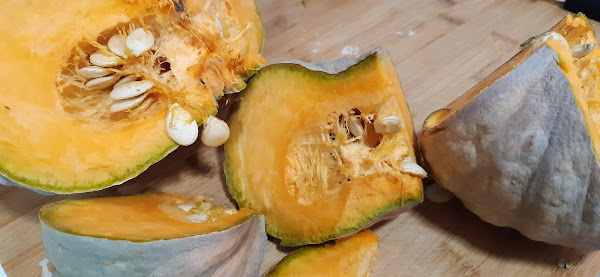 1.- Cortamos la calabaza con piel en trozos más o menos iguales, para que se cueza igual por todos los lados. No quitéis la piel.