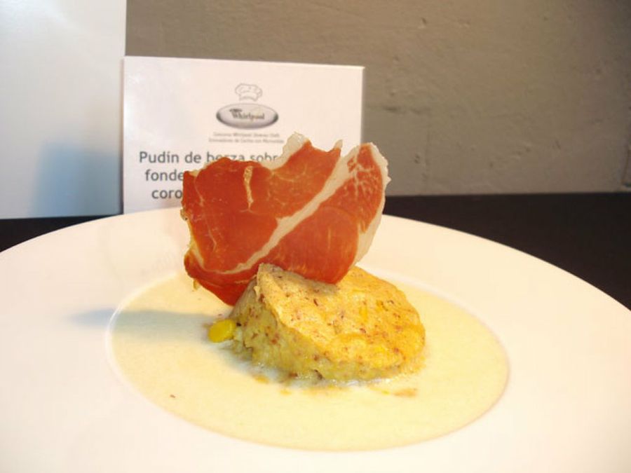 Una original corona de jamón adornaba la receta de Lorena Kudari, la joven representante de la Escuela Superior de Hostelería de Artxanda de Bilbao. La mezcla de sabores estaba garantizada en su ‘Pudin de berza sobre cama de fondeu de queso Ideazábal y corona crujiente de jamón ibérico’.