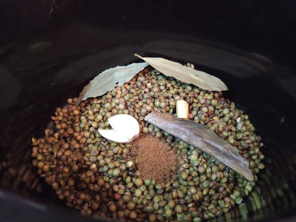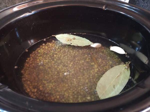 Escurre las lentejas y las colocas en la olla lenta, junto con los ajos, el laurel, el alga kombu, el comino y la sal.