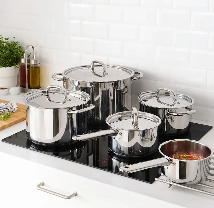 El menaje es el protagonista: para cocinar como un profesional, necesitas herramientas que aguanten el ritmo y no te fallen. La serie de ollas y sartenes IKEA 365+ es el "fondo de armario" de cualquier cocina que se precie. Son robustas, elegantes y tienen ese brillo de acero inoxidable que queda de cine bajo los focos de tu cocina.