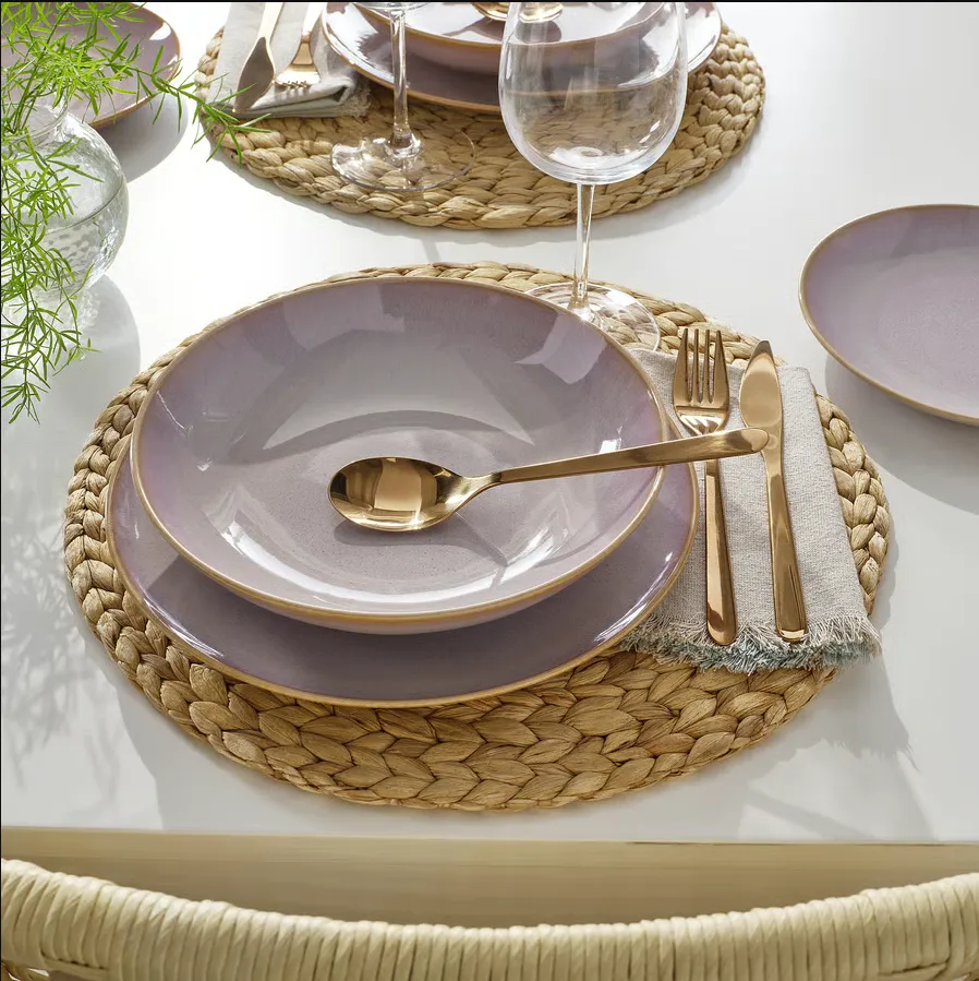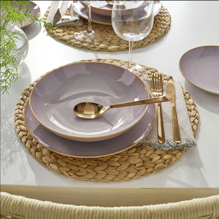 Textiles que abrazan: un buen mantel de lino o unos cojines bien puestos cambian la acústica y la estética de la sala. El gran aliado: si buscas esa estética de "escena de cena elegante", la vajilla FÄRGKLAR es perfecta. Sus acabados mate o brillantes en tonos tierra permiten que la mesa se vea coordinada y profesional sin esfuerzo.