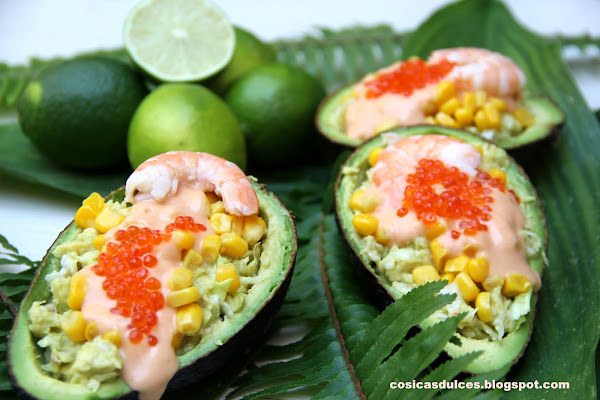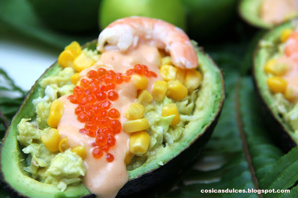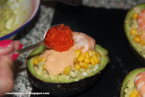 Repartimos sobre los aguacates la salsa que abremos preparando mezclando bien la salsa rosa, el aceite y el vinagre, los langostinos pelados y las huevas de trucha.