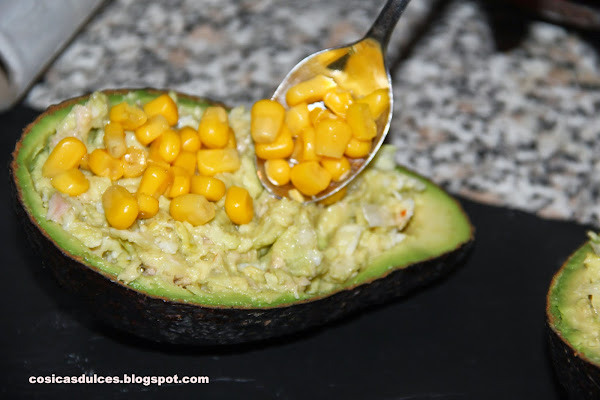 Rellenamos las mitades de aguacate que teníamos reservadas con esta mezcla y sobre ellas ponemos una cucharada generosa de maiz.