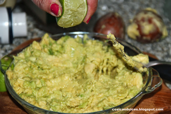 Cortamos en dos mitades los aguacates y los vaciamos (reservando las cascaras). Aplastamos con ayuda de un tenedor toda la pulpa y rociamos con el zumo de la media lima.