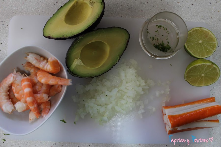 Es una receta muy sencilla, vamos a picar la cebolla muy menudita, los langostinos a trocitos (podemos dejar uno entero por persona para adornar), el aguacate y los palitos de cangrejo también troceados.