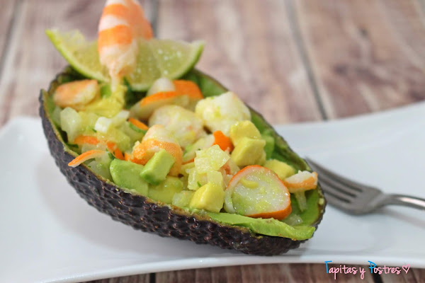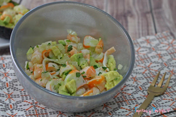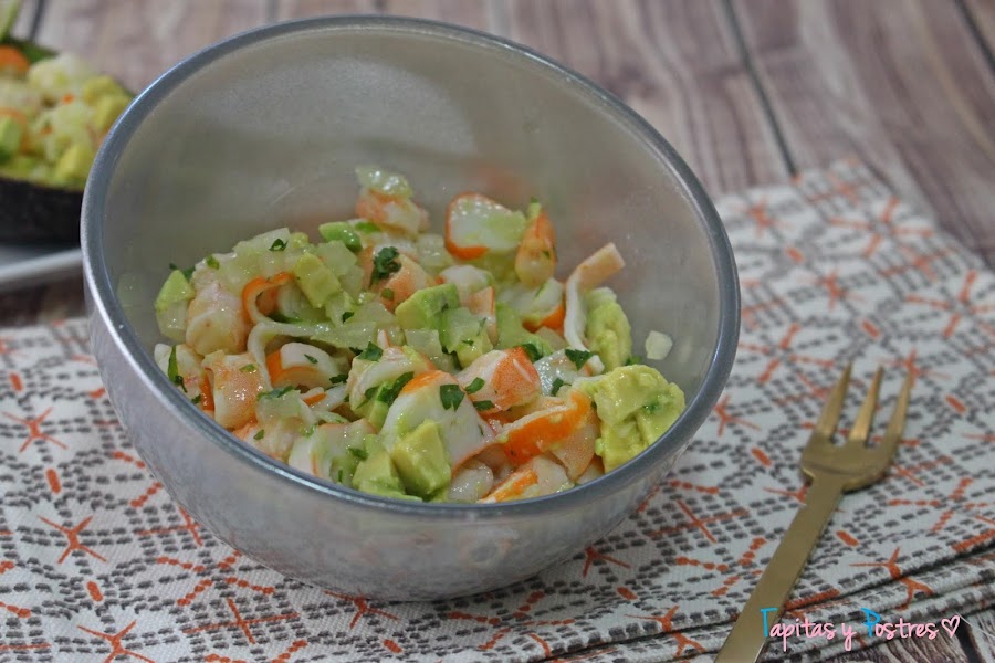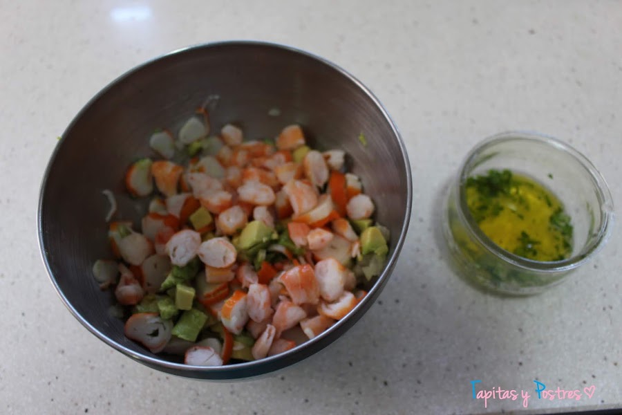 Ponemos todos los ingredientes en un recipiente amplio (langostinos, palitos de cangrejo, aguacate y cebolla) y regamos con el aliño. Mezclamos muy bien y servimos en cuencos o si lo preferimos podemos usar la cáscara del aguacate como recipiente.
